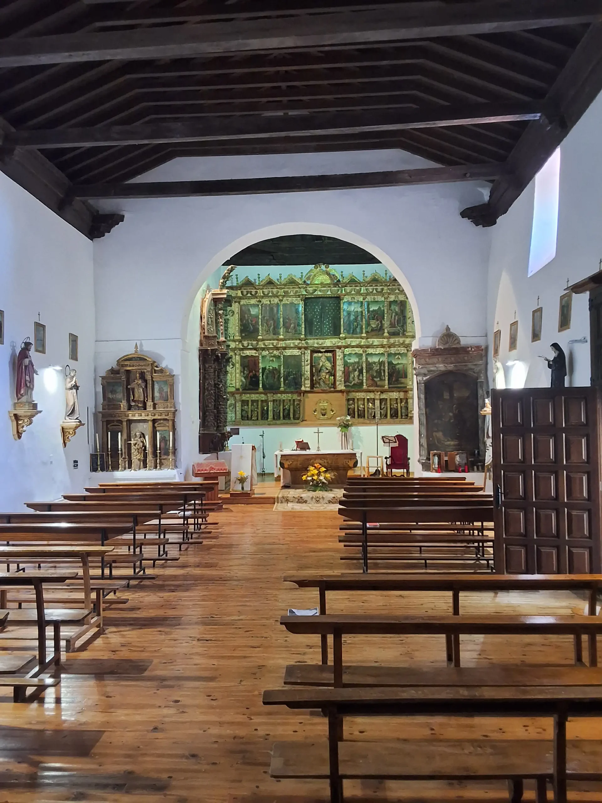 Por ello tras cerrar el culto, eliminamos en la nave el falso techo que cubría la estructura de madera a par y nudillo, constatando que estaba notablemente corrida. La eliminamos en su totalidad, salvo durmientes y tirantes, y volvimos a rehacer el mismo tipo estructural, aunque con algo menos de pendiente.